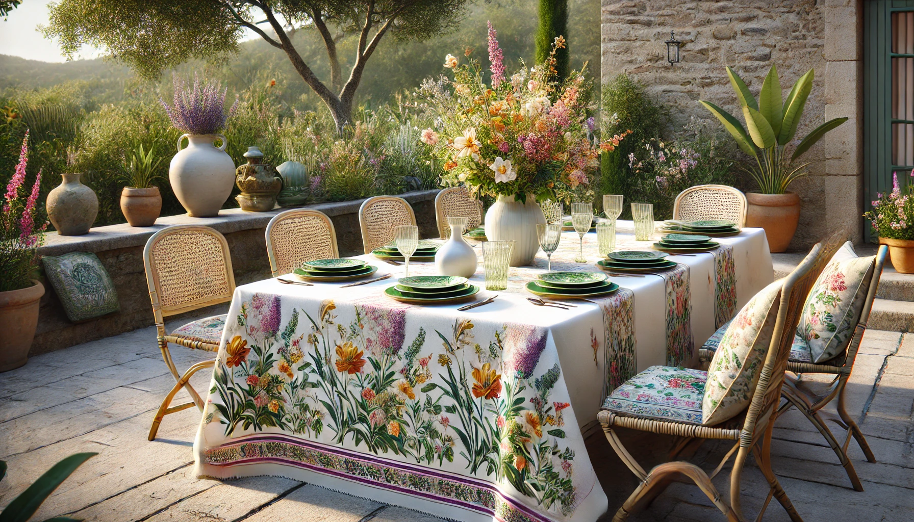 Avec ses teintes naturelles et ses motifs floraux, la nappe Brassée de Fraîcheur s’accorde parfaitement avec une vaisselle en porcelaine, des accessoires en bois et des touches de verre pour un style naturel et épuré.