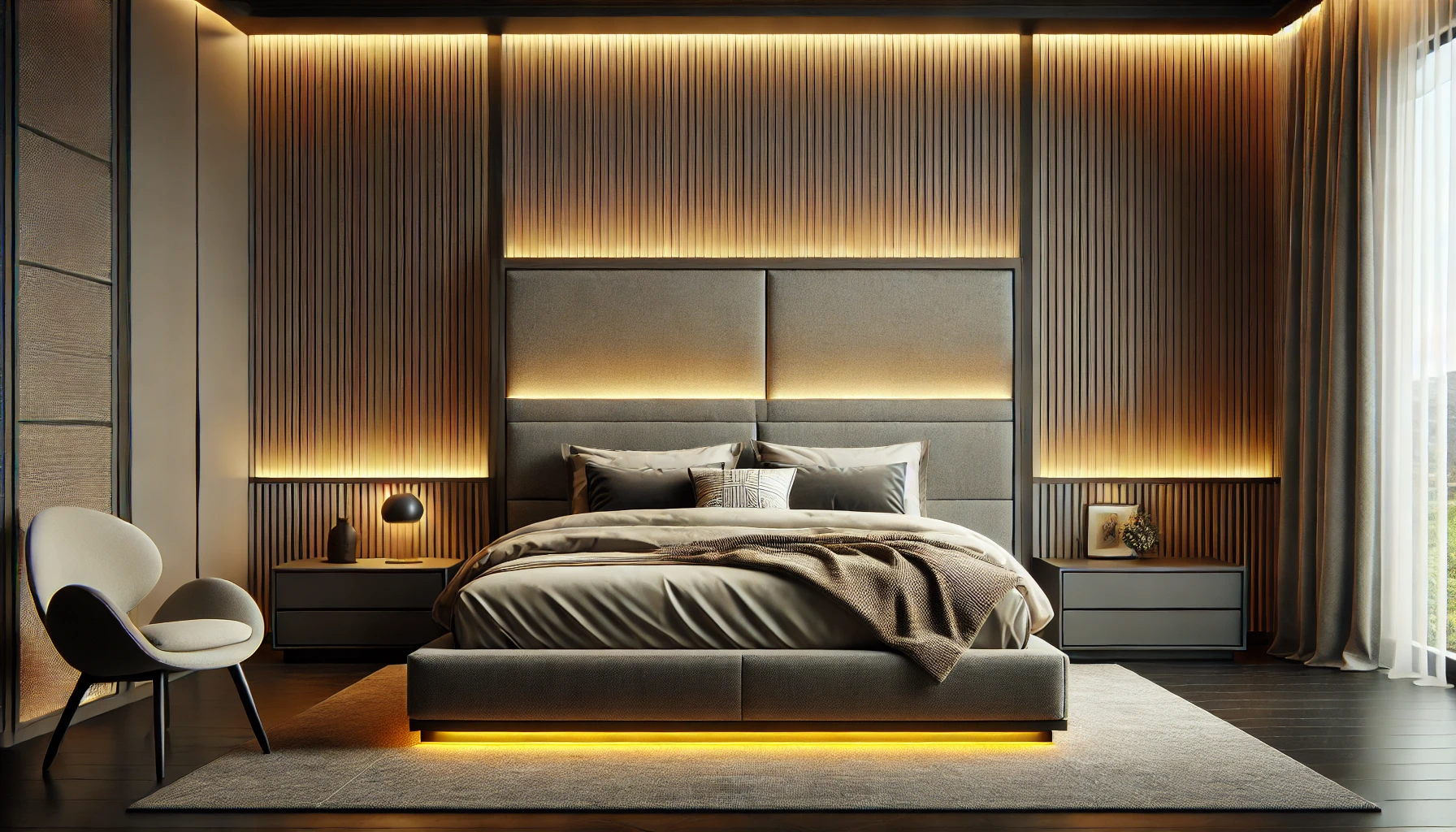 - Tête de lit : escamotable avec éclairage LED intégré réglable (couleur/luminosité)