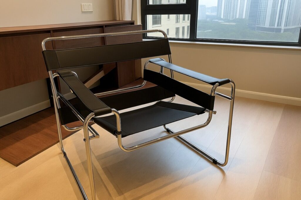 Elle peut également servir de chaise d’appoint élégante dans une chambre, ou de fauteuil unique dans une bibliothèque ou un bureau. Avec ses finitions en cuir, elle assure une durabilité exceptionnelle, tandis que la structure en bois rappelle les formes classiques revisitées dans un esprit contemporain. C’est un objet design autant qu’un meuble fonctionnel.