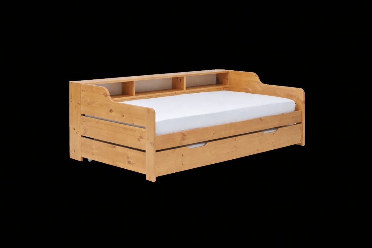 Le lit gigogne Timéo est un lit 90 x 200 cm en pin massif avec sommier inclus, doté d’un tiroir-lit multifonction et de niches de rangement intégrées.