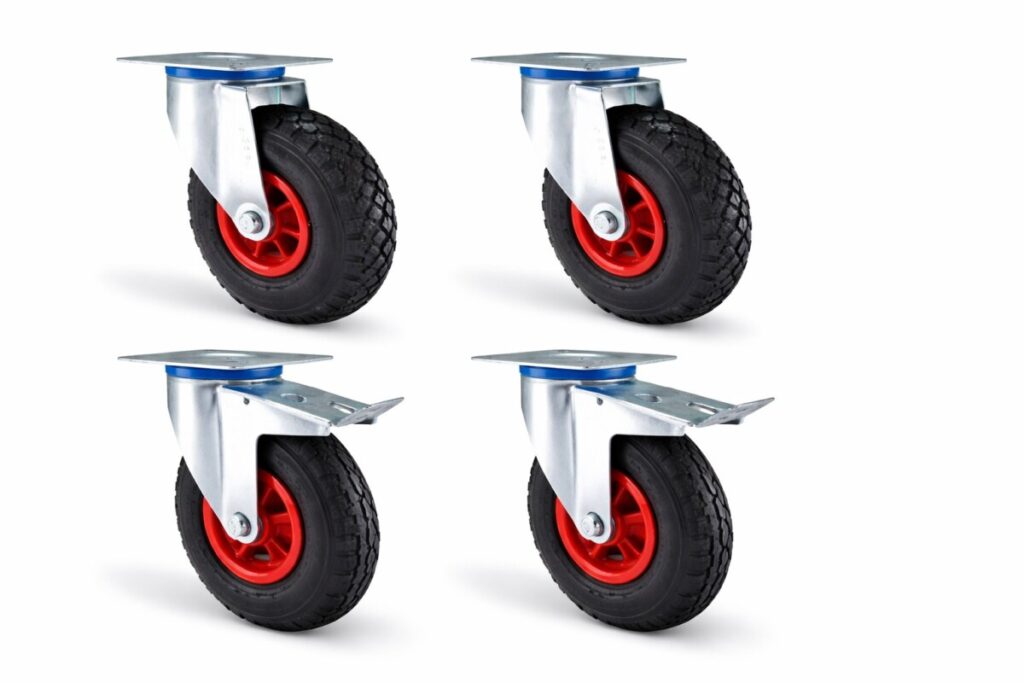 Lot de 4 roulettes pivotantes HTR diamètre 200 mm avec roues gonflables, fixation par platine 140 x 110 mm.