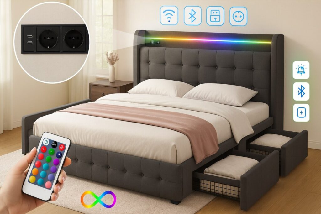 Entre son design capitonné ultra chic, ses 4 tiroirs de rangement intégrés, ses LED d’ambiance, sa tête de lit avec ports USB intégrés et son sommier à lattes inclus, ce modèle coche toutes les cases du lit moderne. Il ne manque que le matelas — et l’excuse pour ne pas craquer.