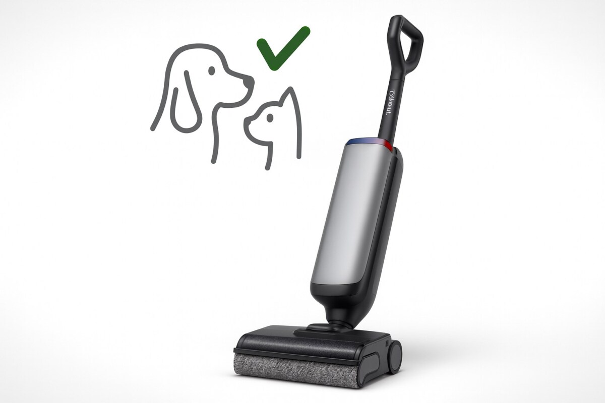 Il est adapté à tous les types de sols : carrelage, parquet, béton ciré, et il est spécialement conçu pour les foyers avec animaux. Son système permet de passer en mode aspiration seule pour gérer les poils, miettes ou saletés sèches rapidement.