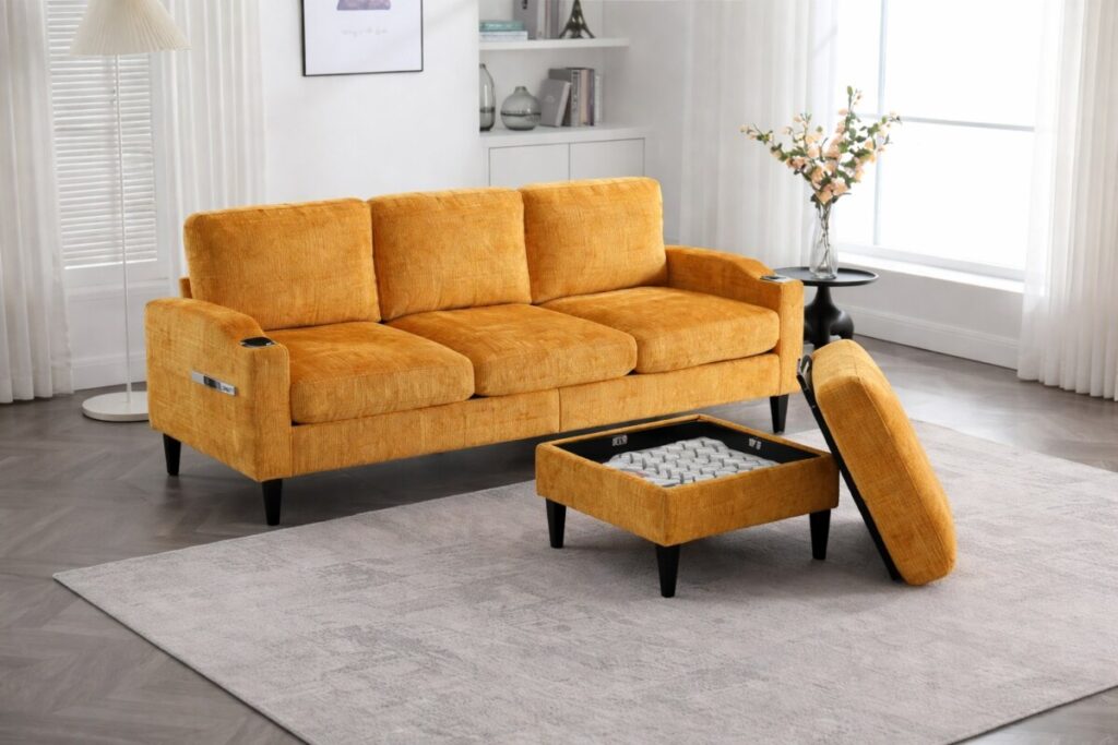 Avec son coloris jaune lumineux (également disponible en gris et noir), ce modèle apporte immédiatement du caractère à votre pièce. Ajoutez à cela un espace de rangement intégré, des poches latérales pratiques et des porte-gobelets intégrés : on est clairement sur un canapé pensé pour le confort moderne.