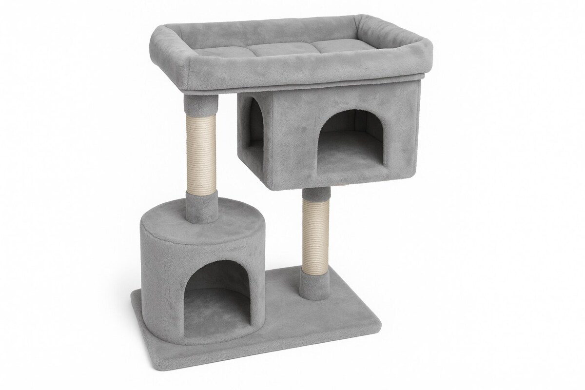 Pensé pour le bien-être du chat et la tranquillité du maître, cet arbre à chat combine sisal résistant pour les griffes, peluche moelleuse pour le confort, et structure bois solide pour la stabilité. Les deux niches fermées (une ronde, une rectangulaire) offrent un espace rassurant pour se reposer ou se cacher.