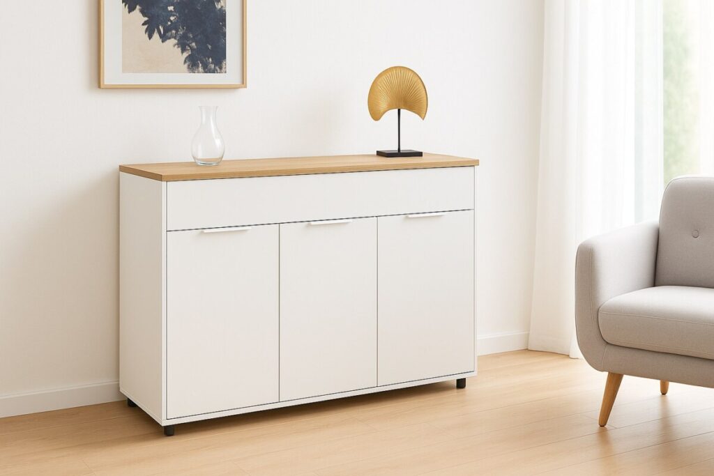 Ce buffet séduit avant tout par sa polyvalence : compact avec ses 100 cm de large, il offre un vrai gain de place sans encombrer visuellement l’espace. Sa structure blanche et son plateau bois effet chêne clair lui donnent un côté à la fois doux et chaleureux, parfait pour un intérieur moderne, scandinave ou rustique chic.