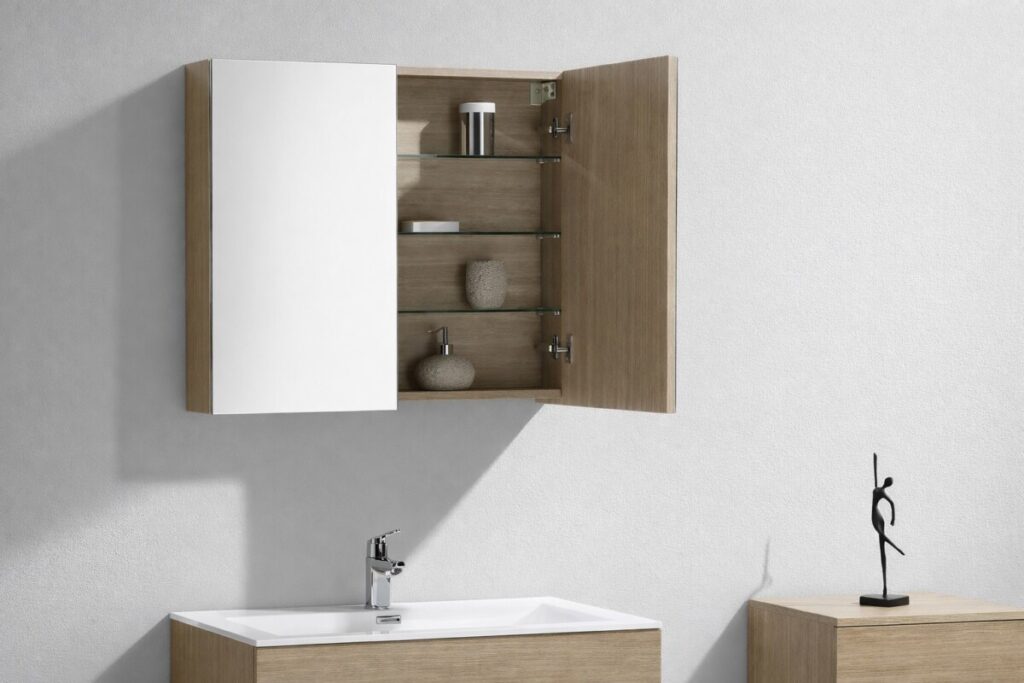 Le chêne clair texturé apporte de la chaleur visuelle, tout en restant facile à assortir à des meubles existants ou à un plan vasque de la même gamme. Ce bloc-miroir permet aussi de réduire le désordre visuel tout en valorisant la pièce, sans effort.