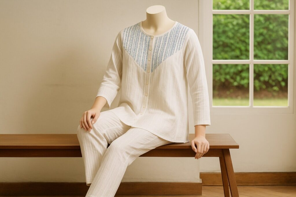 Le Pyjama Nuit à Porto est la quintessence du style discret et chic. Le haut brodé, orné d’un motif bleu élégant, s’accorde parfaitement avec un pantalon uni, pour un ensemble harmonieux et ultra-confortable.