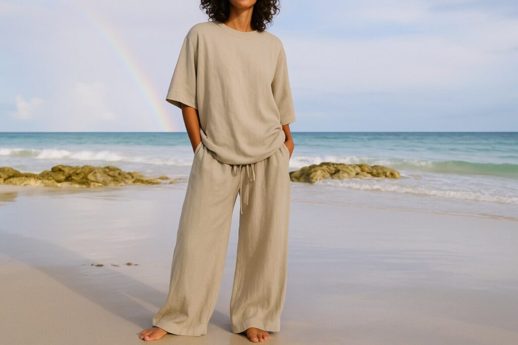 Cet ensemble est un vrai caméléon du dressing. On peut le porter pour chiller, marcher, jardiner, recevoir ou faire un trajet en train avec élégance. Et grâce à sa matière naturelle, il ne colle pas à la peau, même quand il fait chaud. Le style loose chic est totalement dans l’air du temps, et sa taille ajustable est idéale pour les journées détente ou les périodes où l’on veut être à l’aise.