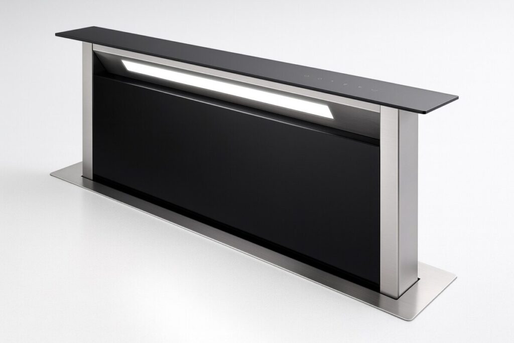 Si vous en avez assez de voir une hotte suspendue au plafond ou accrochée au mur voler toute l’attention dans votre cuisine, alors cette hotte plan de travail est la solution design idéale. Elle disparaît quand vous ne l’utilisez pas et se déploie discrètement pour aspirer efficacement les vapeurs de cuisson. Une révolution visuelle et pratique.