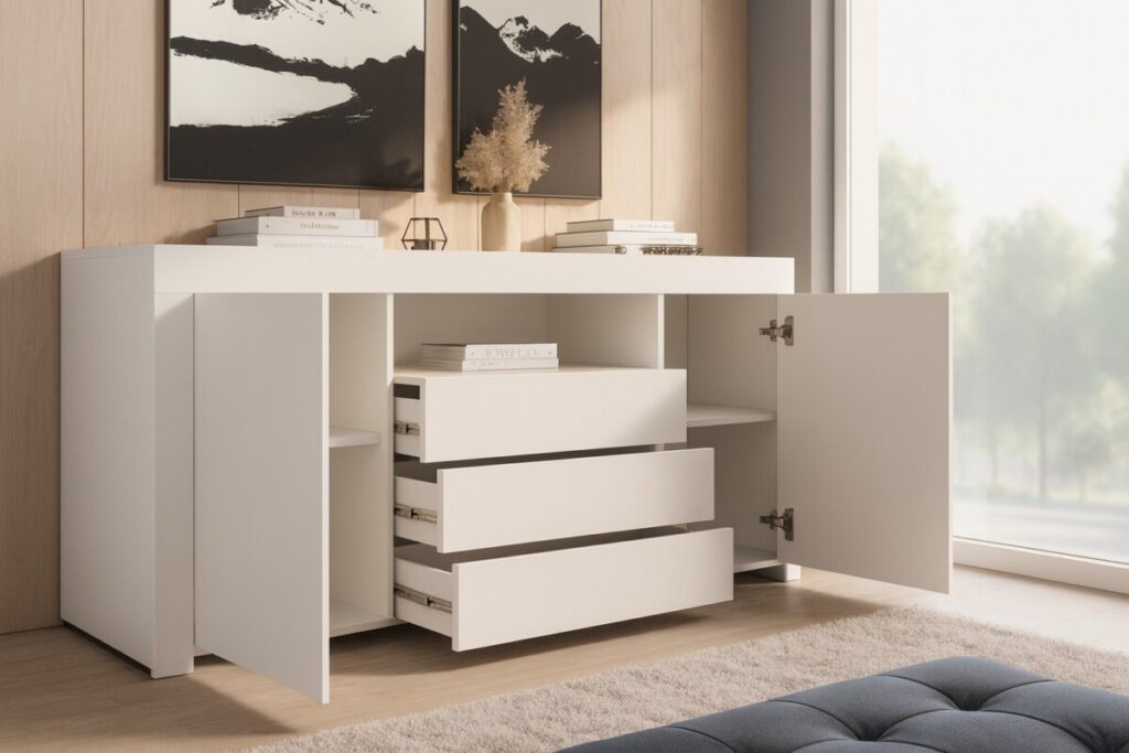 Avec ses dimensions compactes (L 160 x H 72 x P 35 cm), ce buffet blanc est parfait pour gagner du rangement sans alourdir la déco. Il offre une grande capacité grâce à ses tiroirs coulissants et ses compartiments fermés. Idéal pour y ranger vaisselle, documents, linge de maison, câbles ou accessoires multimédia.