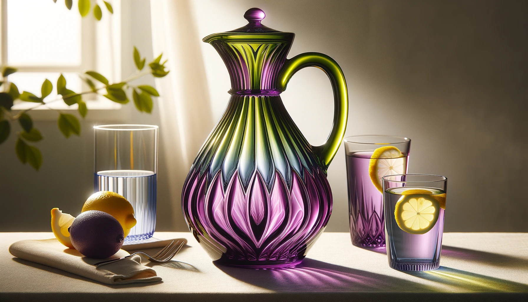 Cette carafe se distingue par son design vibrant et son verre teinté, qui non seulement embellit votre table mais ajoute aussi une dimension esthétique à vos boissons. Sa fabrication artisanale garantit que chaque pièce est unique, avec des détails soignés qui captent la lumière et attirent le regard.
