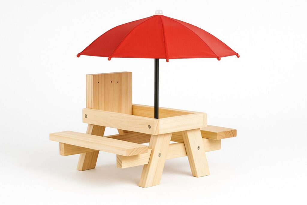- Design : forme de table de pique-nique en bois avec mini-parapluie