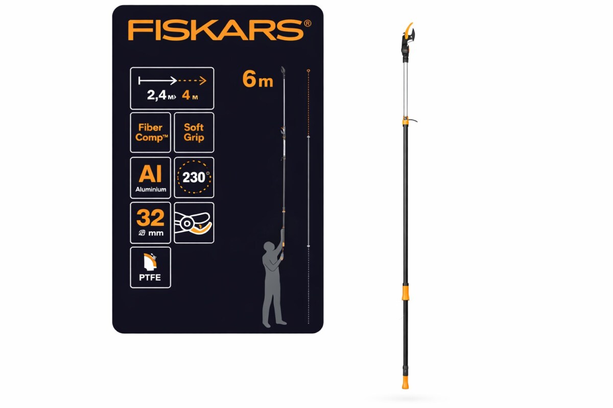 Le Fiskars PowerGear™ X UPX86 est un coupe-branches télescopique de précision. Il permet de tailler sans danger, depuis le sol, même les branches hautes ou enchevêtrées. Son manche extensible va de 2,4 m à 4 m, soit jusqu’à 6 m de hauteur de travail avec la portée bras tendus.