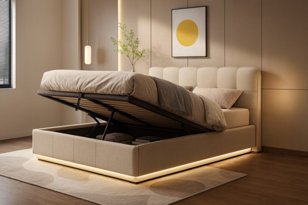 Grâce à son coffre de rangement hydraulique, vous stockez discrètement couettes, oreillers, draps ou valises, même dans les petits espaces. Son revêtement en velours beige ajoute une note chaleureuse et contemporaine à votre pièce. Quant au bandeau LED intégré sous le lit, il crée une ambiance tamisée ultra cosy, parfaite pour les soirées détente ou comme lumière d’appoint sans éblouir.
