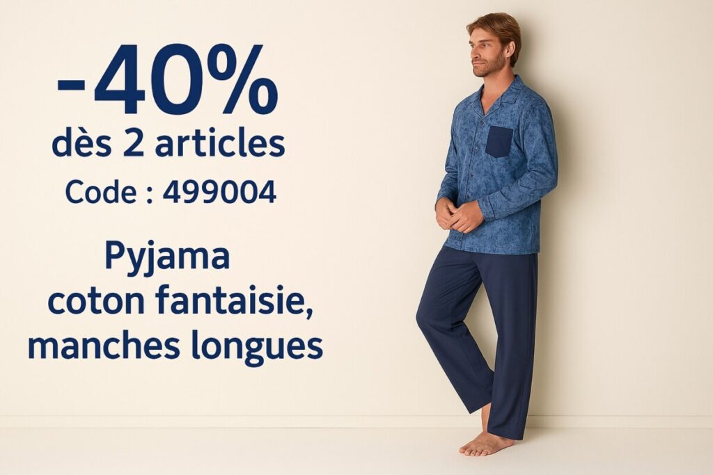 Difficile de trouver mieux pour vos nuits : le pyjama coton fantaisie manches longues (coloris bleu marine) de Blancheporte est à la fois confortable, bien coupé et accessible. Il est actuellement proposé à partir de 34,99 €, avec -40 % dès 2 articles achetés grâce au code promo 499004. Cliquez ici pour commander avant la rupture de stock.