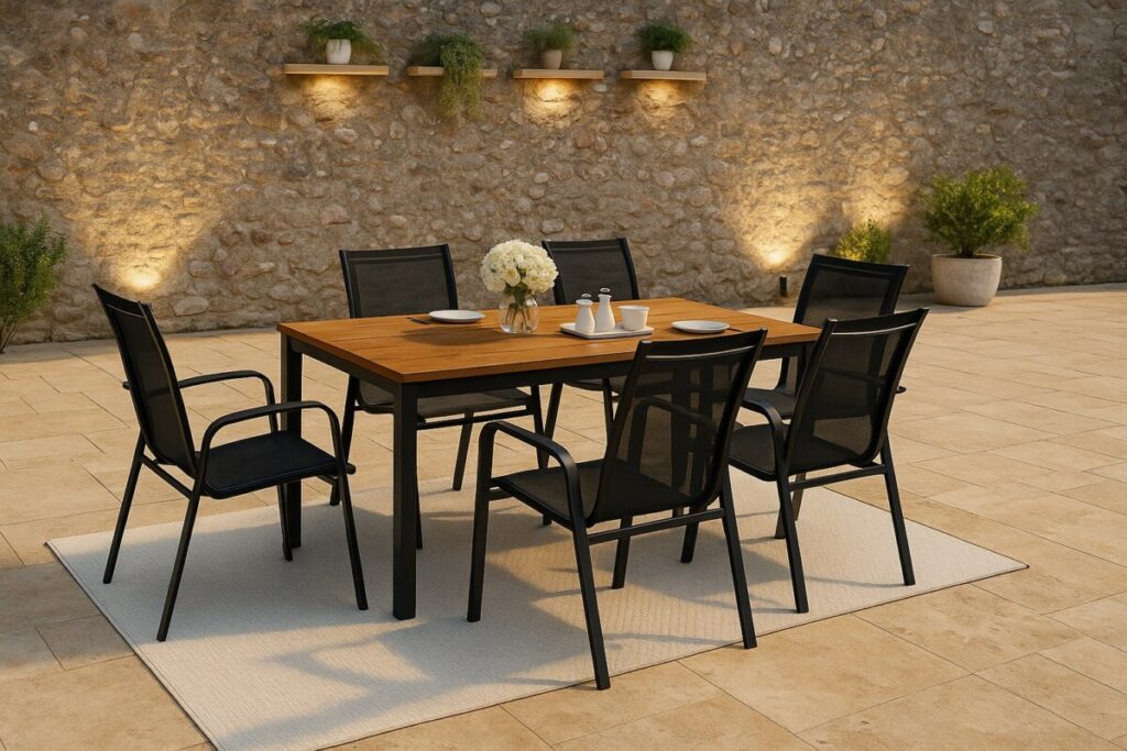 Ce salon réunit tous les atouts d’un mobilier extérieur réussi : élégant, confortable, facile d’entretien et peu encombrant une fois les chaises empilées. Que ce soit pour un repas en famille, un apéro entre amis ou un moment détente, il offre un vrai confort d’assise et une grande praticité.