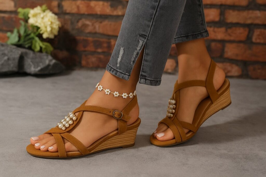 - Modèle : sandales compensées bohèmes à perles