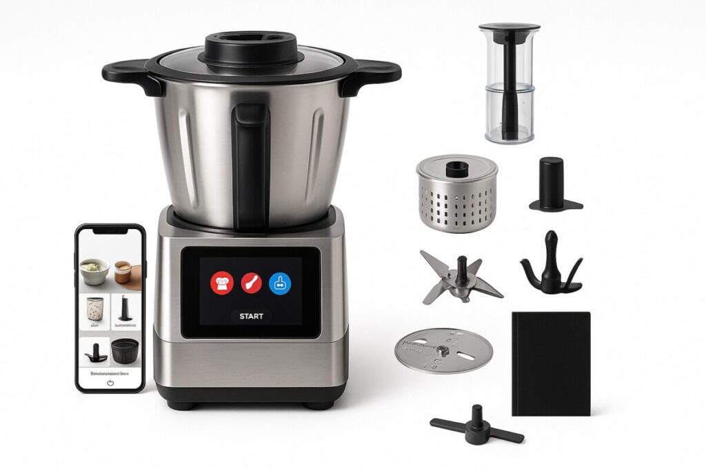 - Fonctions multiples : battre, fouetter, pétrir, émincer, couper finement, hacher la viande, râper, mixer, chauffer, cuire vapeur, mijoter, rissoler, peser