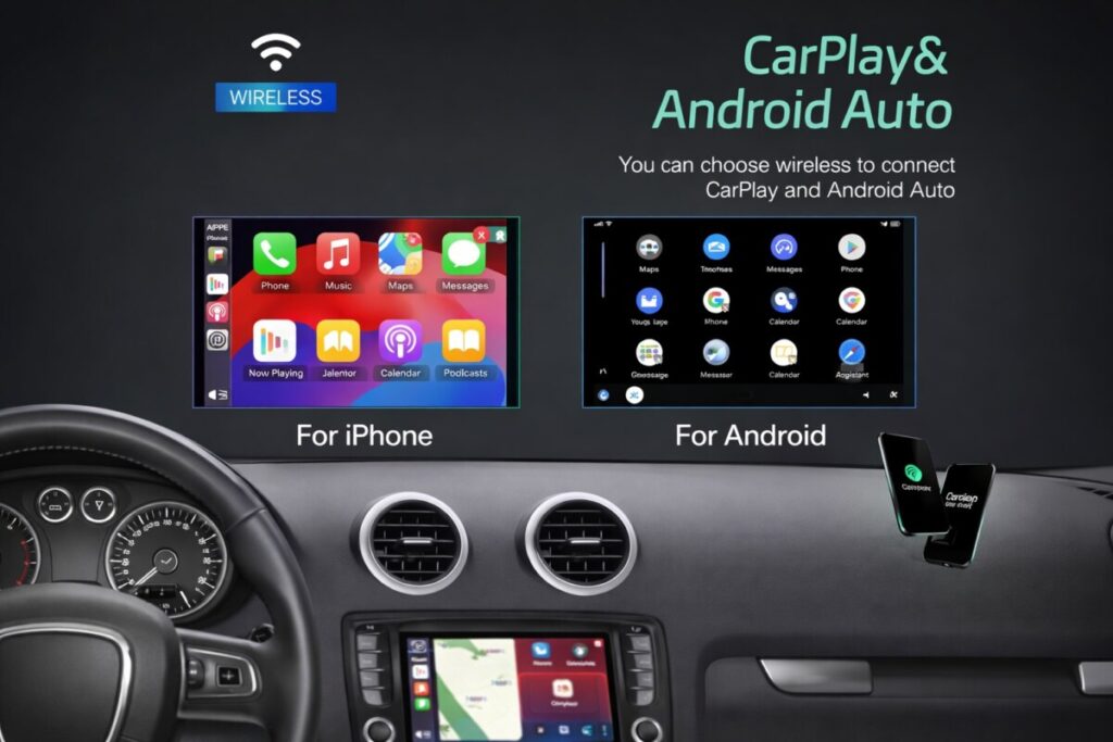 Ce modèle Podofo intègre Apple CarPlay et Android Auto, permettant de connecter facilement un smartphone et d’afficher les applications compatibles sur l’écran du véhicule.
