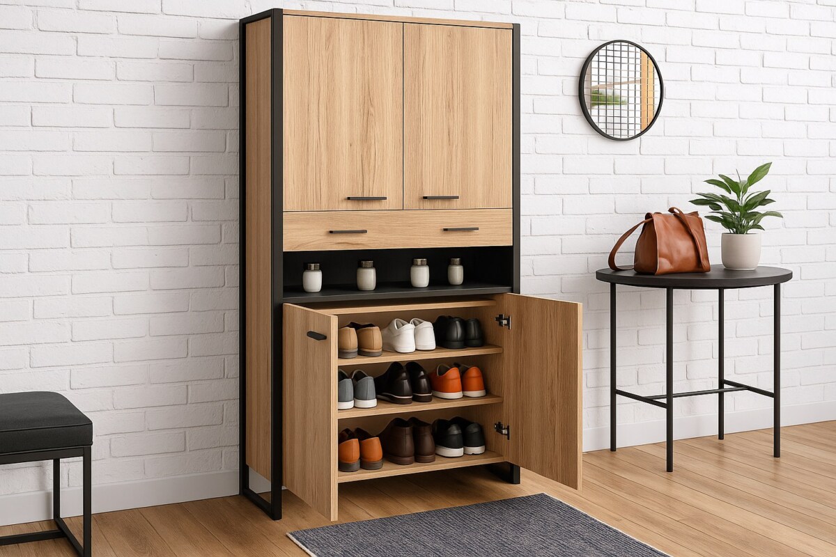 Avec ses étagères intérieures généreuses, cette armoire permet d’organiser jusqu’à 48 paires en toute discrétion. Fini les bottes qui traînent et les baskets empilées : tout trouve sa place derrière les 4 portes fermées. Le tiroir central, lui, est parfait pour les lacets, chausse-pieds, semelles ou produits d’entretien.