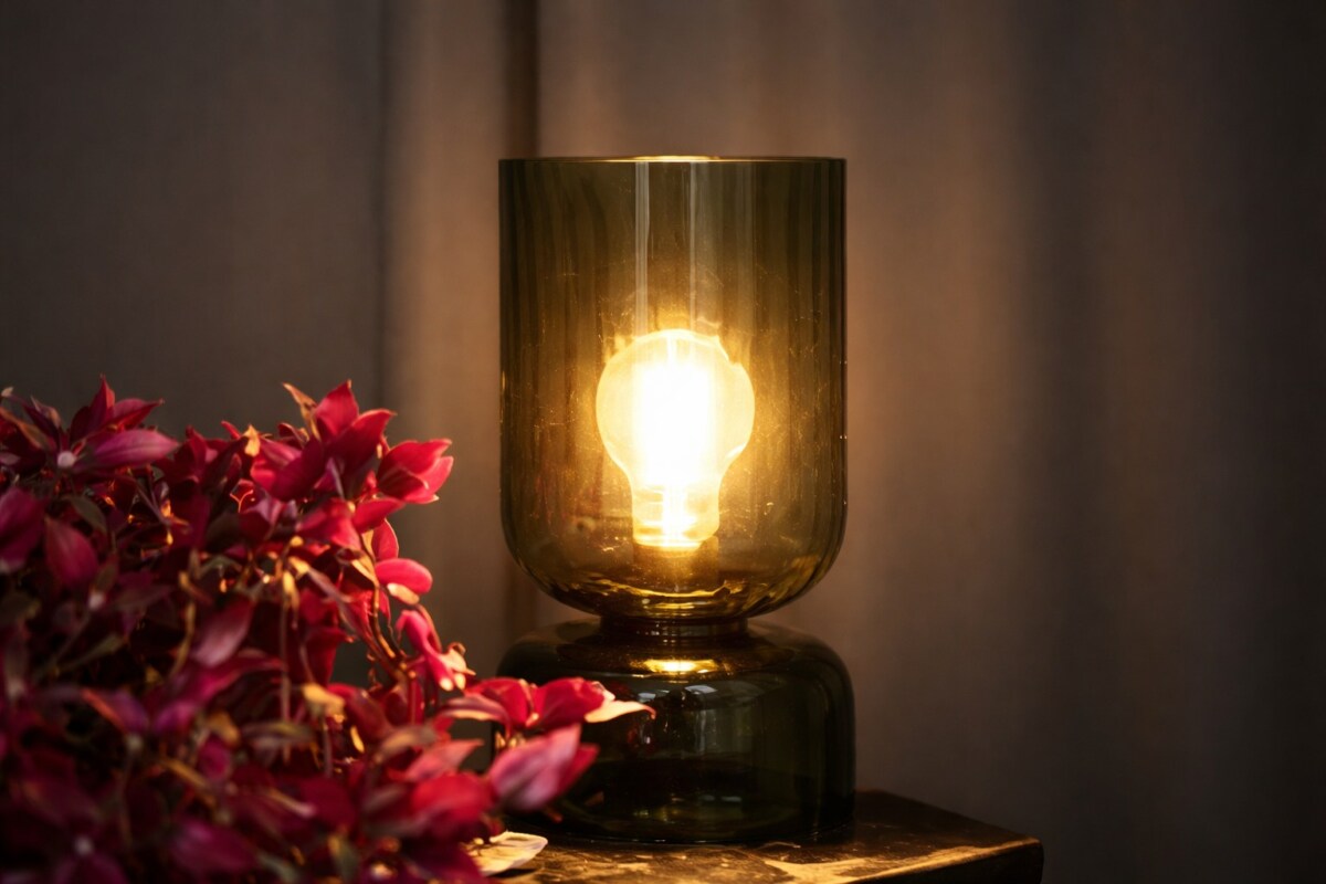 Elle trouve facilement sa place sur une table de chevet, un buffet ou un bureau. Son verre vert fumé capte la lumière de manière subtile, créant des reflets élégants qui donnent du relief à votre décoration.
