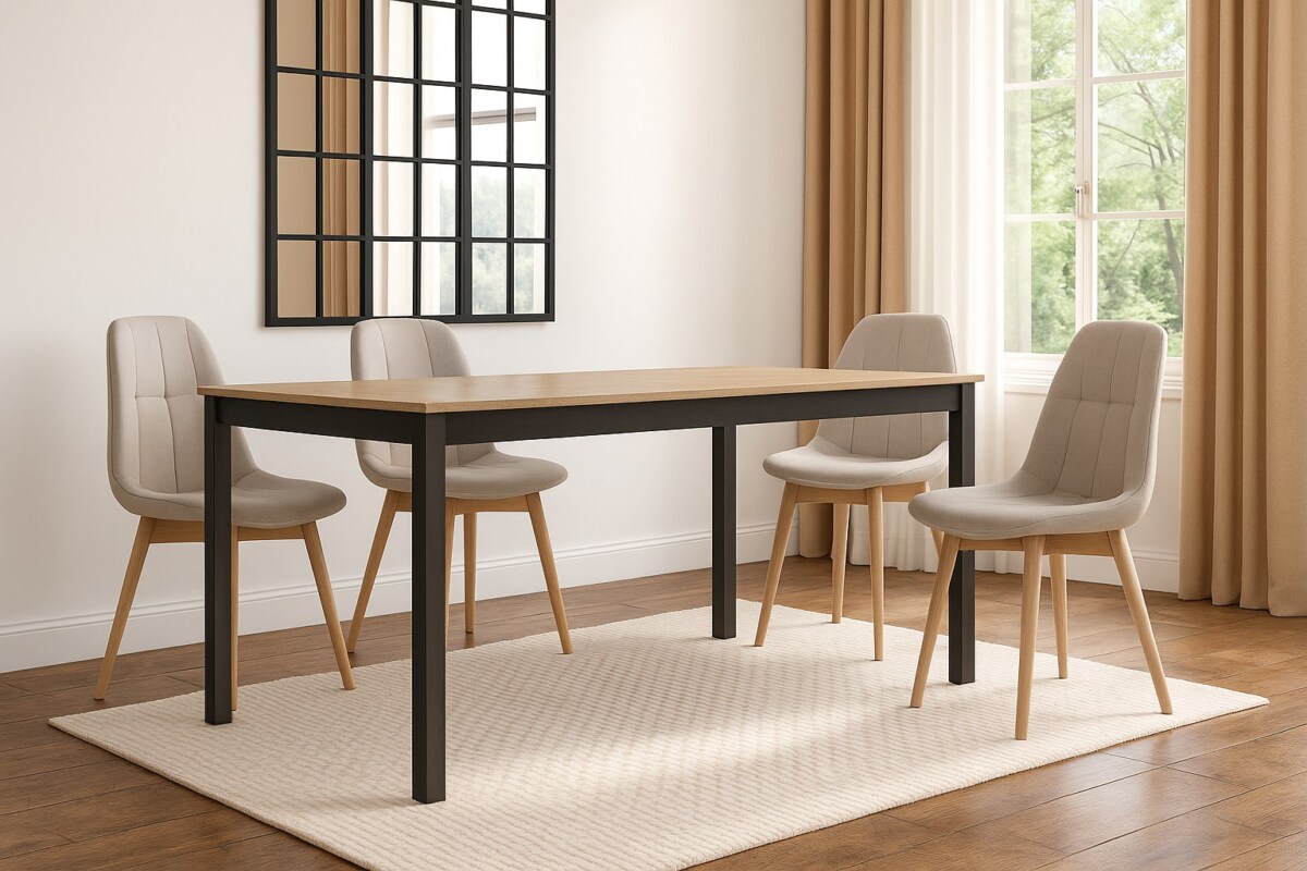 Son plateau effet bois clair s’accorde parfaitement avec les pieds noirs carrés, pour un rendu à la fois chaleureux et sobre. Elle s’intègre aussi bien dans une cuisine ouverte que dans une salle à manger au style rustique ou industriel doux.