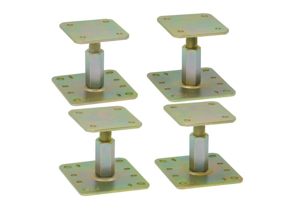 Chaque pied du kit est réglable en hauteur de 100 à 150 mm, permettant de rattraper les irrégularités de sol ou d’adapter la hauteur selon votre projet. Le filetage interne intégré à la platine inférieure permet une rotation libre de réglage, tout en assurant un ancrage ferme une fois serré.