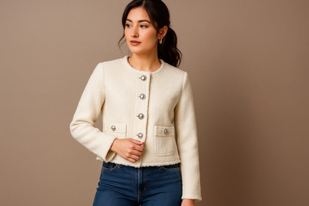 - Effet tweed : texture visuelle chic, esprit tailleur haut de gamme.