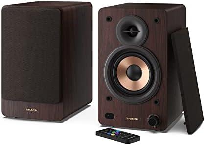 - 1 Sharp CP-SS30(BR) Pair of Active 2-Way Shelving Speakers with Wooden Case, Bluetooth v5.0, USB, Optical, Auxiliary, RCA, Bass and Treble Adjustment, Removable Grill, Remote Control