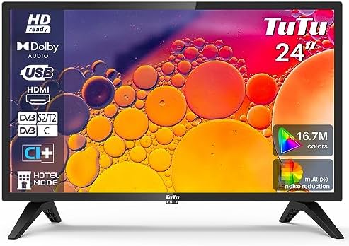 TuTu TUB24F1DN Téléviseur 24 Pouces (TV 60 cm) LED HD Écran TV Pas Cher avec Triple Tuner (DVB-T/T2-C-S/S2), HDMI, VGA, Lecteur Multimédia USB, CI+, Modèle Hôtel, 220 Volts pour Cuisine Chambre