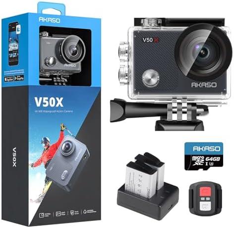 AKASO V50 X Caméra de Sport avec Carte Mémoire microSDXC U3 64 Go, Action Camera Sport 4K 30FPS Ultra Full HD Stabilisateur avec Télécommande Écran Tactile Angle Réglable Kit d’Accessoires