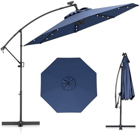 - 1 COSTWAY 3M Professional Cantilever Parasol 32 LED Solar Garden Parasol with Crank, Tilt and 360° Rotation, Cross Base, for Patio, Terrace, Balcony (Navy Blue)