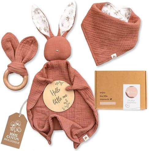 - Doudou lapin : Ultra-doux en coton biologique, il accompagne bébé partout et l’aide à s’endormir paisiblement