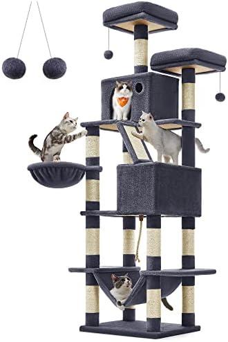 - 1 Feandrea Arbre à Chat, Hauteur 206 cm, avec 13 Griffoirs, 2 Plate-Forme, 2 Niches, Panier, Hamac, Pompon, Tissu Peluche, Multi-Niveaux pour Chat d’Intérieur, Gris Foncé PCT190G01