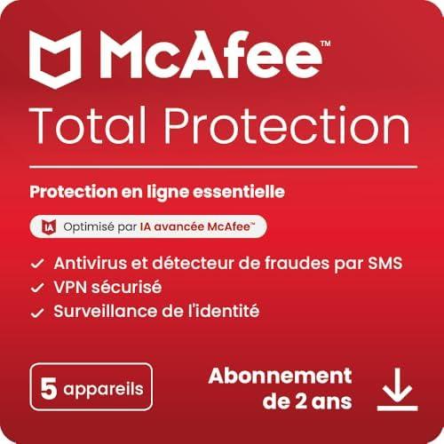 McAfee Total Protection 5 appareils 2025 | 2 ans | VPN sécurisé, logiciel de sécurité avec antivirus, gestionnaire de mots de passe et surveillance de l’identité | Téléchargement