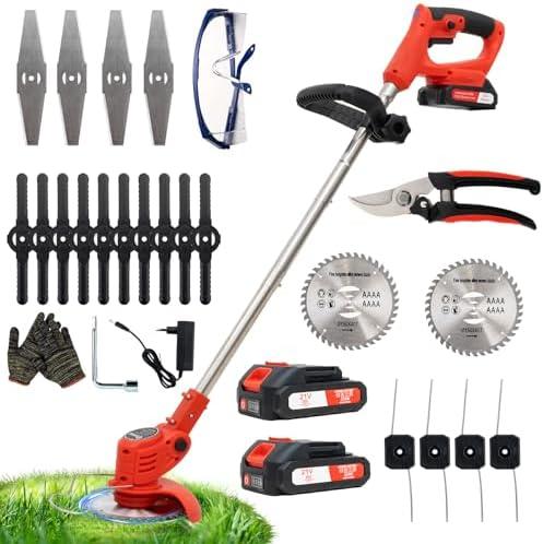 - 1 Cordless Electric Brushcutter, Folding Lawn Trimmer with 2 Batteries and 4 Types of Blades, Adjustable Handle, Edging Cutter for Cutting Garden, Lawns and Agricultural Land