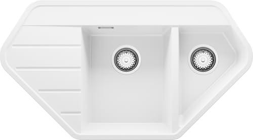 - 2 PRIMAGRAN Copenhagen Corner Granite Corner Sink 90 x 50 cm White Kitchen Sink with 1.5 Basins + Drain Kit 80 cm
