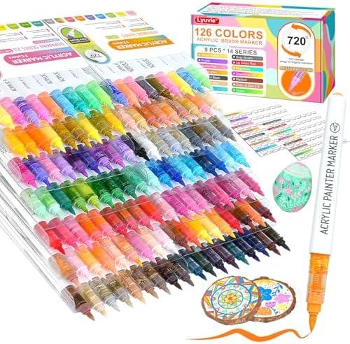- 1 Lyuvie 126 Couleurs Feutres Acrylique, 1-6mm Marqueur Peinture Acrylique Stylo Pointe Pinceau - Acrylic Paint Marker à Base D’eau pour Pierres, Papier, Tissus,Bois, Cailloux,Verre et Plastique