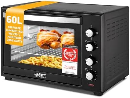 Enfin, ne partez pas sans que je vous aie présenté le TZS First Austria - Mini-Four 60L 2000W. Avec ce four spacieux encore plus imposant, je vous assure que vous pourrez concocter des pizzas gigantesques et impressionner vos convives ! Réglable jusqu’à 230°C et offrant 6 modes de cuisson, laissez libre court à votre imagination culinaire. De plus, il est équipé d’un minuteur de 60 minutes, de 4 hauteurs d’insertion, d’un plateau, d’un grille et même d’un tournebroche rotatif ! Le roi de la soirée pizza, c’est bien vous.