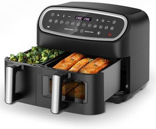 - 3 Gidgimo Oil Free Deep Fryer 10L, Air Fryer 2 Compartments 9in1 Cooking Programs, Max 230° Air Fryer XXL with Window, Touch Screen, Smart&Match Finish and Cook, – 80% Fat – G230 Ultra