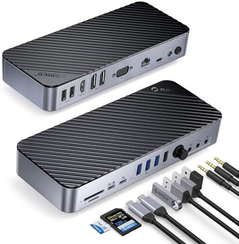 ORICO 20 in 1 Docking Station, Triple Displays USB C Hub with 2 DP, HDMI, VGA, 60W PD, Type C 3.2 18W PD, USB C 3.2, 3 USB A 3.0, 3 USB A 2.0, RJ45, 3 Types AUX, SD/TF, Volume Button