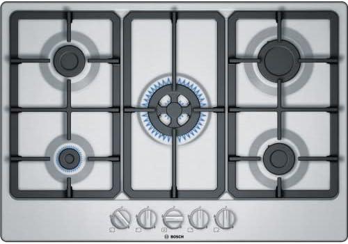 - 1 Bosch PGQ7B5B90 - plaque de cuisson à gaz – Série 4-5 foyers – Brûleur wok - 75 cm – Verre Trempé – Inox