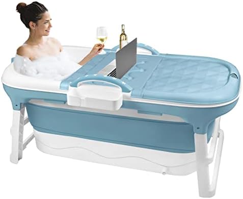 Uisebrt – Baignoire pour adulte – Pliable et portable – Avec couvercle amovible, panier à savon et rouleau de massage – Taille L – 118 x 62 x 53 cm – Convient pour petite salle de bain – Bleu