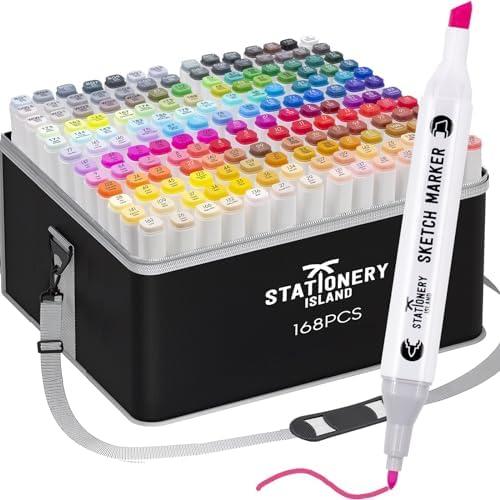 STATIONERY ISLAND Marqueurs à alcool à double pointe pour adultes et enfants – Marqueurs permanents pour mise en évidence du design, graphique, bande dessinée, manga (168 couleurs avec sac)