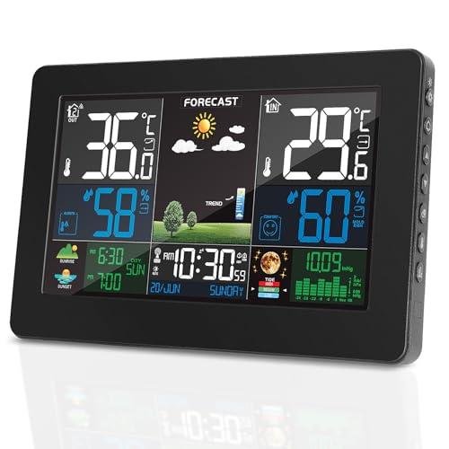 Station Météo Avec Capteur Extérieur, DCF Écran LCD Sans Fil Coloré Météorologique Numérique Baromètre Phase de Lune Alarme Réveil Météo Prévision Rétroéclairage Réglable