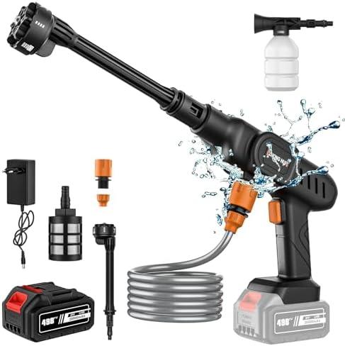 - 4 Nettoyeur Haute Pression sans Fil, Pistolet à Eau Haute Pression, 60Bar Nettoyeur Haute Pression sur 1 Batterie, 30000 mAh, Chargeur et Tuyau de 5M, pour Voiture, Maison, Brushless Pressure Washer