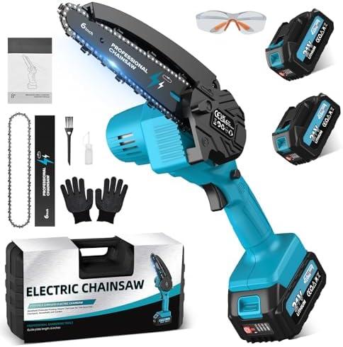 - 1 Mini Battery Chainsaw, 6 Inch, 900W Cordless Electric Chainsaw with 2 x 4000 mAh, Additional Chain, Charger, Tool Box, Battery Pruner for Pruning Garden DIY Projects