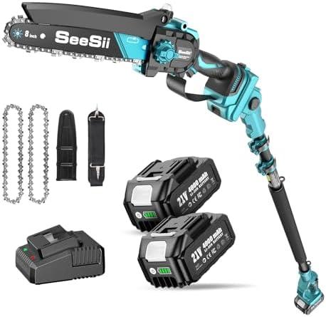 - 3 SEESII PS810 Mini Chainsaw & Pole Pruner 8 Inch, 2-in-1 Battery Chainsaw, with 2 x 4000 mAh Batteries, Range 4.87 M, Automatic Oil System, for Branches and Garden