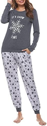 Bresdk Pyjamas Femmes Coton Noël Ensembles de Pyjama Hiver À Manches Longues Vêtements de Nuit Col Rond Impression de Flocon de Neige Chaud Doux